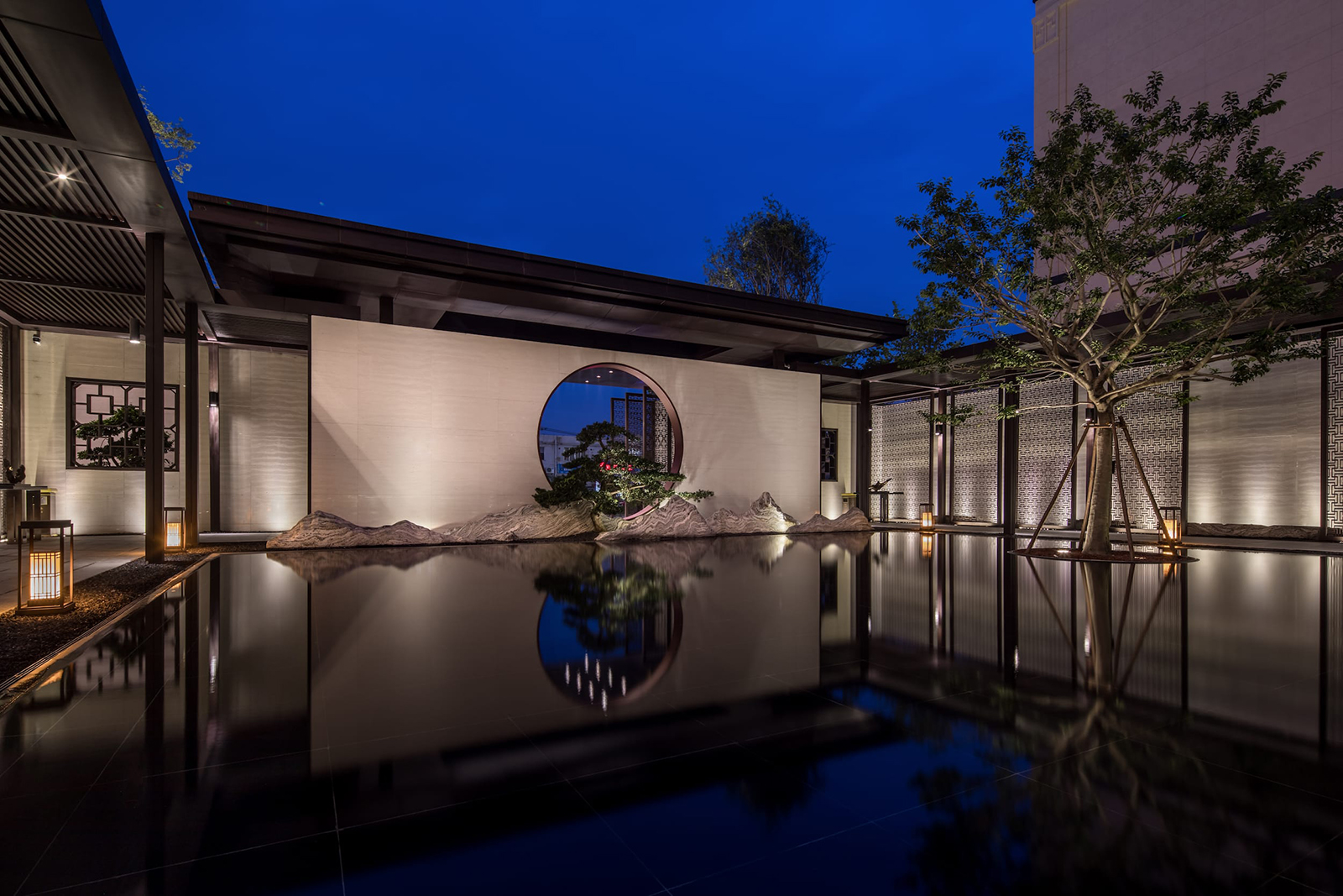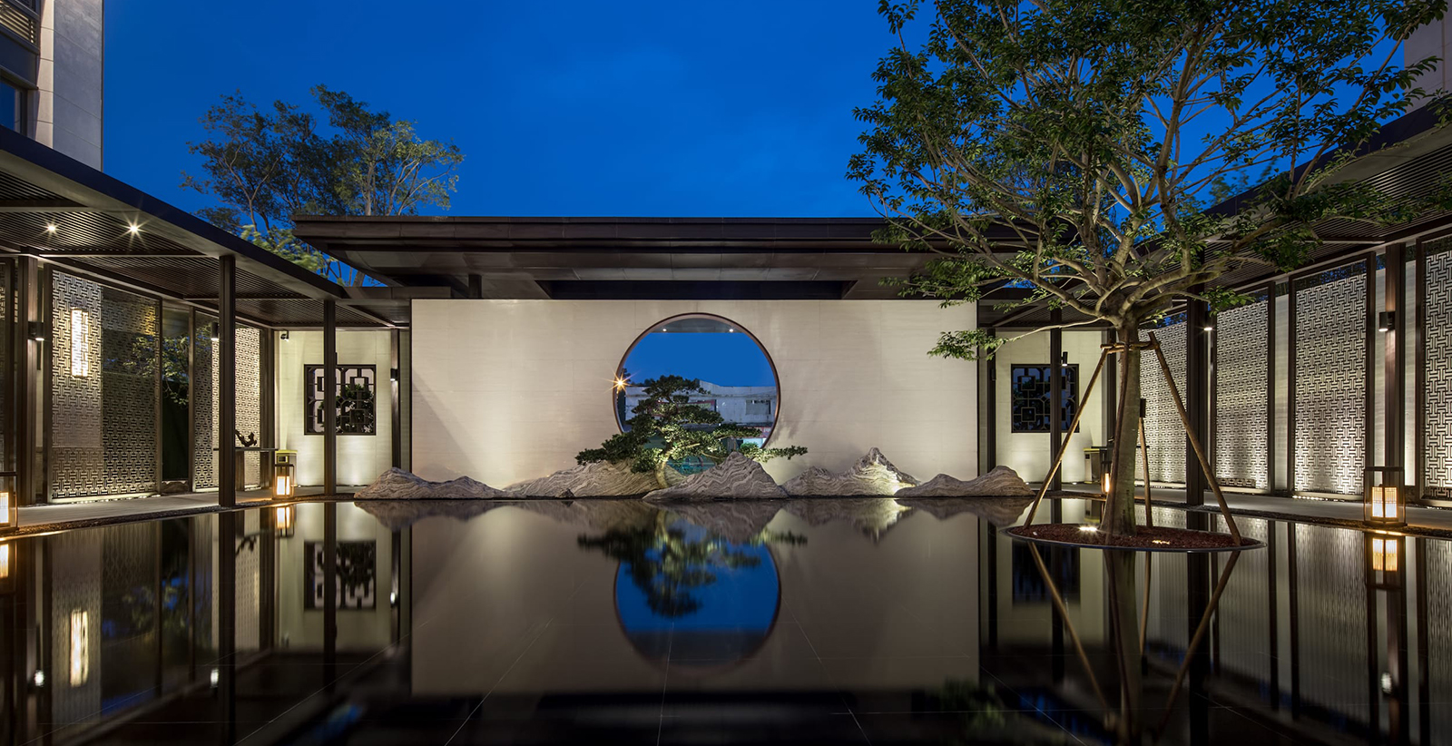 中心水景花園作為中軸核心,東入口向園而行,途徑極具東方雅韻的禪意枯山水,一橋轉(zhuǎn)折入境,借新中式設(shè)計手法,由虛轉(zhuǎn)實,虛實絞合,將山水理念融匯其中,鏡水回廊營造水天大境,張弛有度的描繪一幅大氣優(yōu)雅的現(xiàn)代山水畫卷。意境脈絡(luò)從西入口至中園同樣的上演:穿過屏風(fēng)、月洞景墻,藏著一片唯美山水畫境:水廊鏡天、松石浮玉皆歸此園。不分遠(yuǎn)近,不知高下,月洞之后,更像一個故意的偶然,一點點構(gòu)建游園的驚喜。