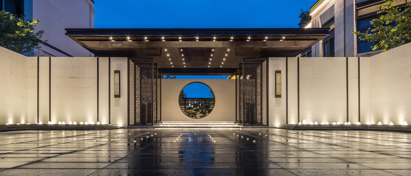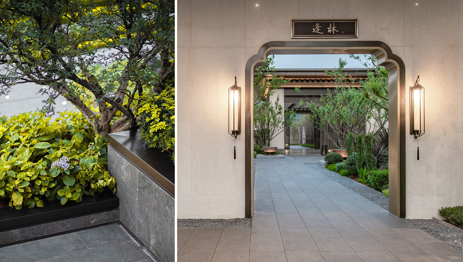 居者歸家,表現(xiàn)一個府系主題的入口,通常是厚重的。若想舉重若輕的傳達(dá)府園的高貴感,文化意境的融入和儀式感的空間轉(zhuǎn)換應(yīng)不可或缺。