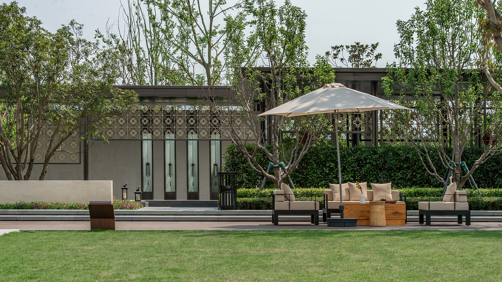 “璽”者:至高無上也,“瑯”從玉,良聲,形容似玉的美石,白玉無暇。汲取“璽瑯”意蘊作為文化主題內(nèi)涵,并將其提煉為景觀設(shè)計元素,以傳統(tǒng)府園文化為基礎(chǔ),延續(xù)文人園林格局。將“天人合一” 的園林思想融入場地,用現(xiàn)代手法演繹中式格調(diào)。在每一進(jìn)空間中,融入展現(xiàn) “玉石氣質(zhì)” 的景觀元素,營造人文、境雅的藝術(shù)化景觀空間。