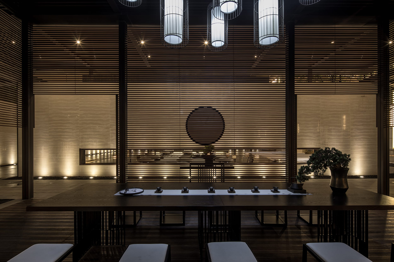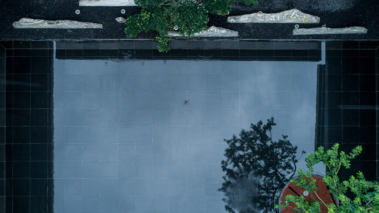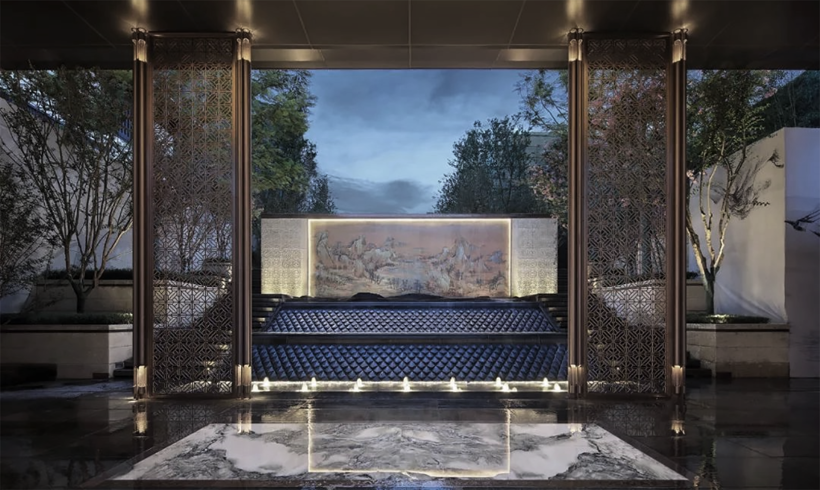 府院境的林泉是文人的林泉,將山水的形意融入到方寸的玉器上是古人表達(dá)喜愛的方式。西入口借助5.45米的內(nèi)外高差,采用六寶歸家禮制,門頭、御燈、光階、疊水、照壁、三山六大景觀元素,禮溯一宅風(fēng)水,規(guī)制禮儀,疊水瑯瑯如玉鳴,千里江山圖絹畫山水照壁,格柵之后設(shè)一池三山枯山水制境,兩側(cè)林蔭成趣,猶如境入山林,將臺、池、壁、光影等意境提煉、演化并植入場地,再現(xiàn)一幅具有文人林泉形意的現(xiàn)代山水畫卷。